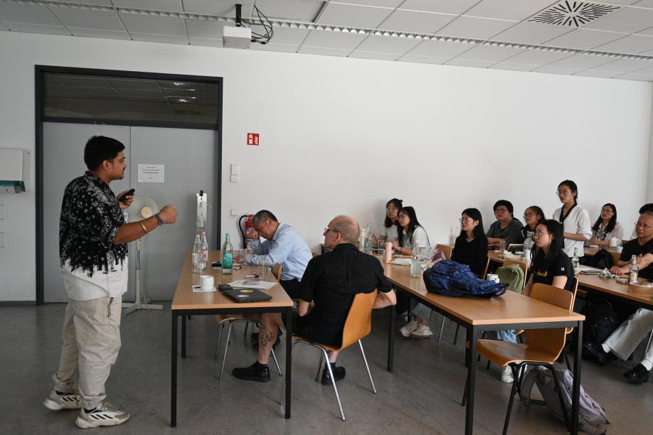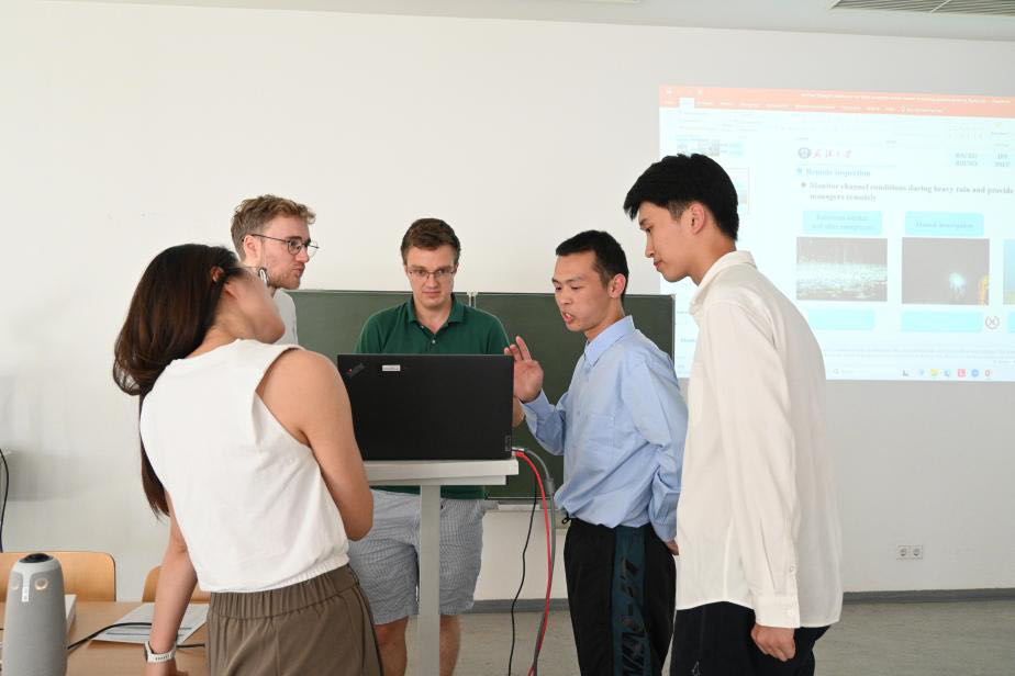 随后,实践队成员和Hinkelmann教授的研究团队进行了PPT汇报与学习交流会。Hinkelmann教授与夏军强教授依次介绍了柏林工业大学与威廉希尔足球官网的基本情况及各自团队的研究项目及成果。在员工交流汇报中,实践队成员黄定武、周张驰小组介绍的 Underwater Eye( 可实时获取渠道水力参数的设备)引起了大家的兴趣,就该设备的精度、使用情景与改进措施进行了深入探讨。Hinkelmann教授团队的介绍则聚焦于城市水系统的管理,在提及管网系统物质传输模型时,实践队成员蔡珺就动力传输与对方进行了深入交流。大家畅所欲言,交流互鉴,队员们既拓宽了视野,也学习到了国外高校员工的思维方式与质疑精神,为未来的研究生涯积累经验。