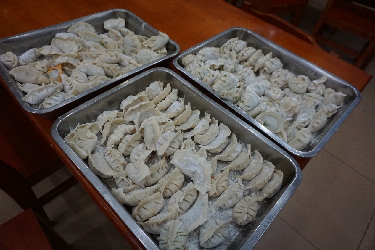 接下来的包饺子环节将整场活动推向高潮。在整个环节中,工作人员向每个小组分发饺子馅、饺子皮、面粉等包饺子需要的食材和工具。各小组还分别推选出代表,参与了蒙眼包饺子、男女合作包饺子等包饺子游戏。游戏过程紧张刺激,在“最美饺子”环节中,选手们包出的饺子形形色色、各有千秋,有圆肚状、花边状、三角花朵状,甚至还有玫瑰花状,令人大开眼界。最后,包好的饺子交给食堂师傅煮熟后,同学们吃着自己包的饺子,脸上洋溢着幸福的笑容,十分满足。