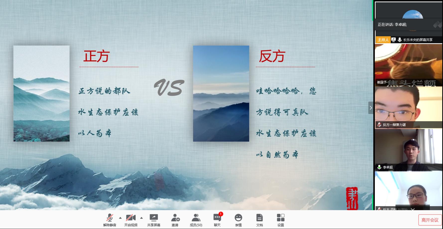 本次“云辩论赛”以水生态保护应该以人为本还是以自然为本为辩题进行展开,正方辩题为“水生态保护应该以人为本”,反方辩题为“水生态保护应该以自然为本”。正方辩题围绕着“以人为本绝不是人类中心主义”、“‘主体—客体—主体’的交往实践观”和“以人为本是把保护生态环境追求人类持续发展作为社会价值目标”三个根本论据展开;反方辩题围绕着“以自然为本更加强调了人类与自然和谐发展的重要性”、“以人为本理念无可避免的要以人类的已知碰撞大自然的未知” “以人为本的理念终究无法逃脱人类中心主义的窠臼”这三个辩驳点展开。经过精彩的驳辩质询环节后,双方总结陈词,辩论赛告一段落。