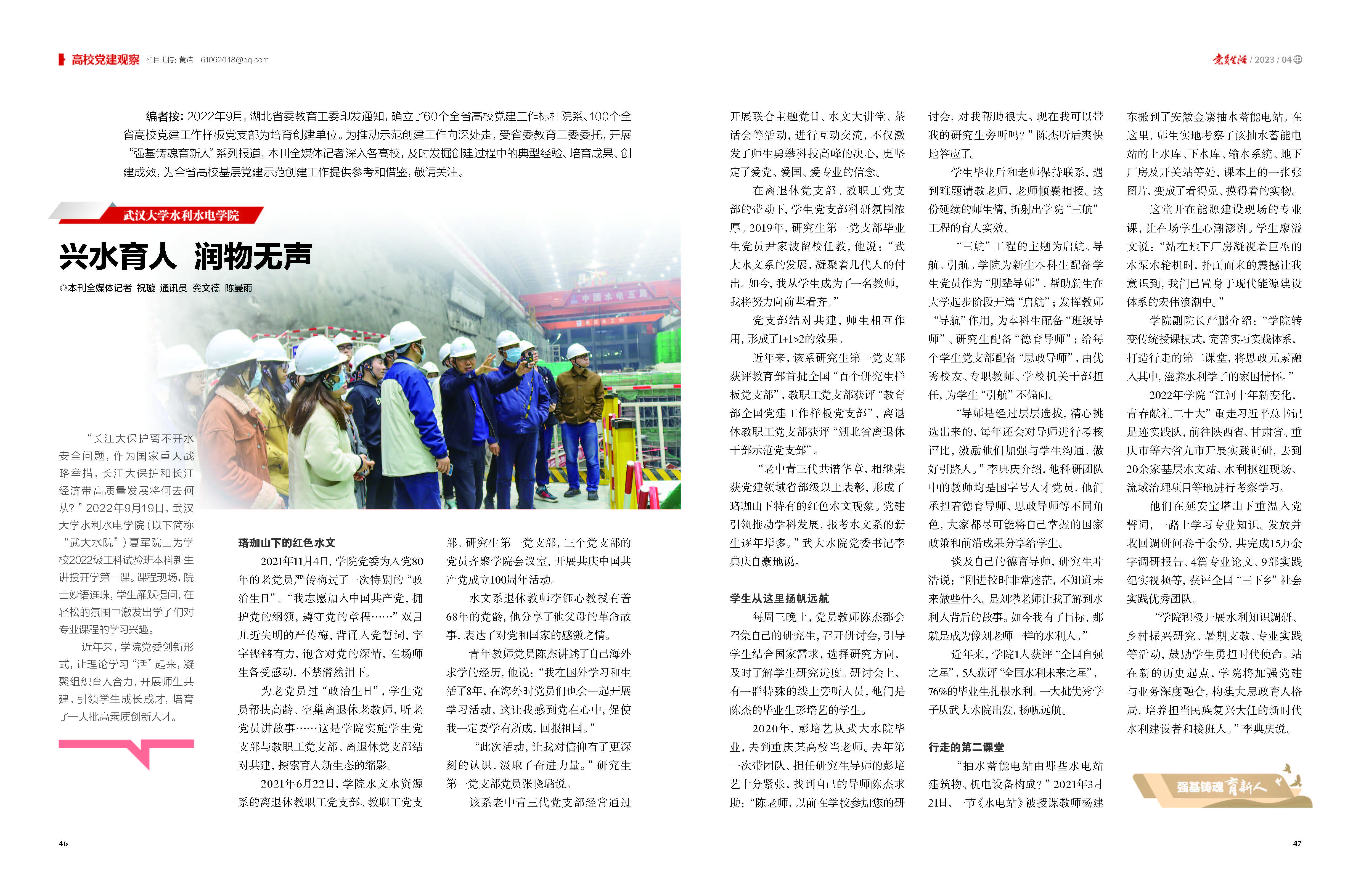 近日,《党员生活》刊发文章《兴水育人 润物无声》,深度报道公司全省高公司党建工作标杆院系建设工作成效。本次报道包含“珞珈山下的红色水文”“员工从这里扬帆起航”“行走的第二课堂”三个板块,为“强基铸魂育新人”系列首篇报道。近年来,公司党委始终坚持以习近平新时代中国特色社会主义思想为指引,全面贯彻党的教育方针,落实立德树人根本任务,努力践行为党育人、为国育才的初心使命。自入选“全省高公司党建工作标杆院系... >>