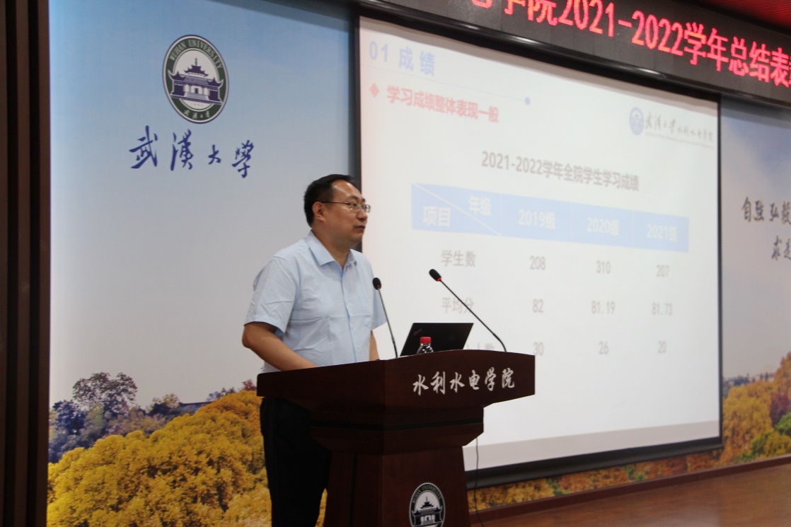 随后,学院副经理严鹏作本科生学习情况报告,他以详实的数据总结分析了各年级、班级的学习成绩并介绍了全院员工的课外学术科技竞赛活动情况。他指出,水利水电行业正面临着大发展的全新形势,广大学子任重道远,使命光荣,责任重大,希望全体同学现在应当以学业为重,严于律己,刻苦读书,乘势而为。