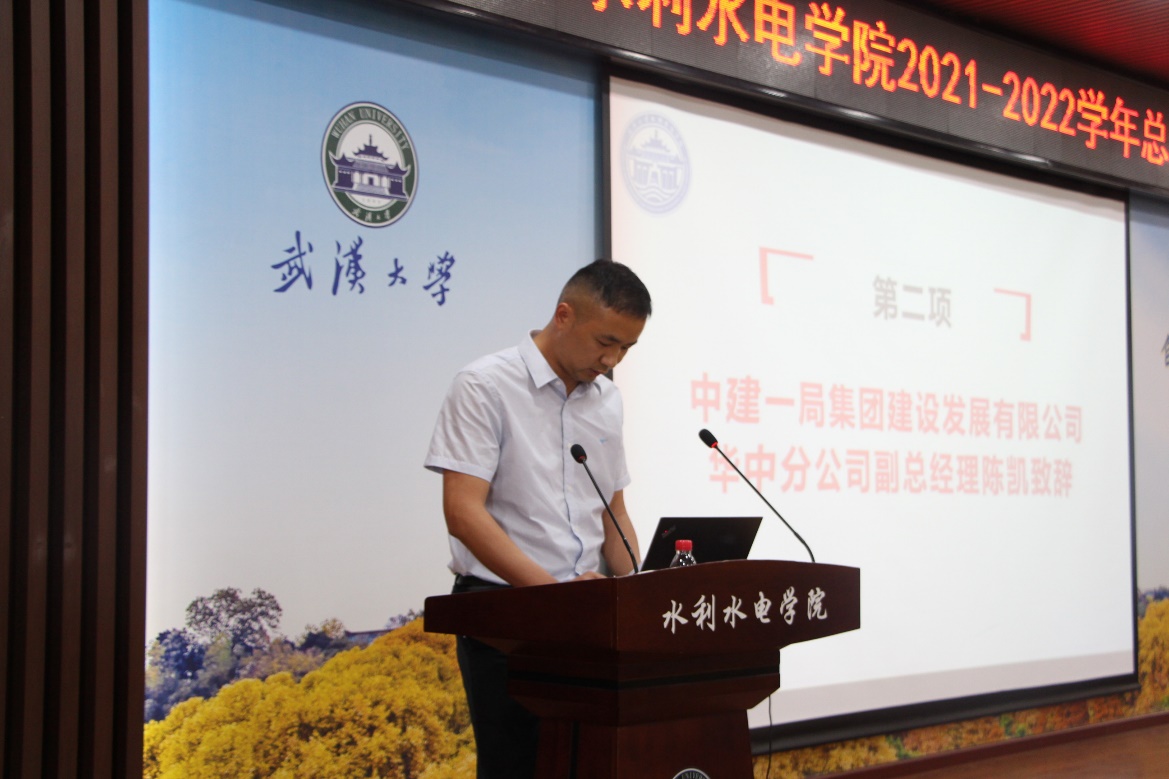 会议第一阶段为学习表彰大会。首先,中建一局集团建设发展有限公司华中分公司副总经理陈凯致辞。作为学院的校企共建单位,中建一局建设发展有限公司赞助了本次员工总结表彰大会的全部奖品。陈经理对受邀来到威廉希尔表示荣幸,并对今天获得表彰的各位同学表示祝贺,他同时指出,水利水电行业未来前途光明,勉励在座的同学努力学习,树立远大理想,为国家未来发展做出杰出贡献。