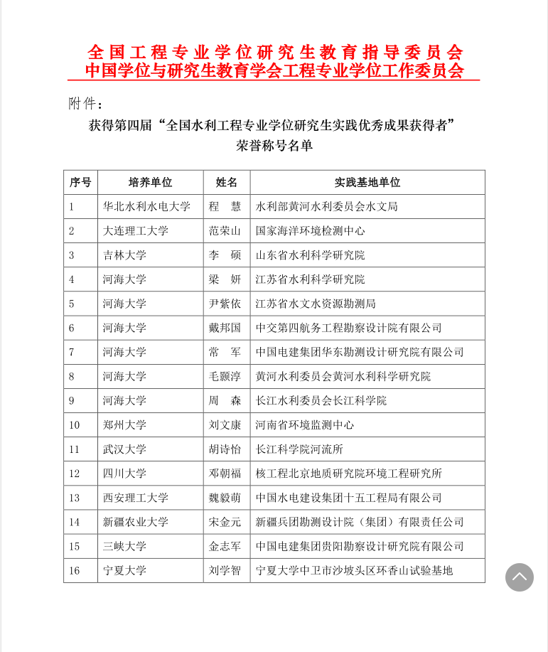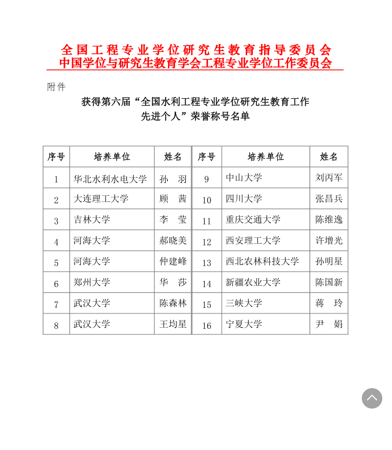 文件公布了16名 “全国水利工程专业学位研究生优秀指导教师”、20名“全国水利工程专业学位研究生教育先进个人”和16名“全国水利工程专业学位研究生实践优秀成果获得者”,其中公司共6名师生受到了表彰。杨国录、程永光和管光华3位老师荣获第二届“全国水利工程专业学位研究生优秀指导教师”;陈森林和王均星老师荣获第六届“全国水利工程专业学位研究生教育先进个人”;2016级专业学位硕士研究生胡诗怡同学荣获第四届“全国水利工程专业学位研究生实践优秀成果获得者”称号。