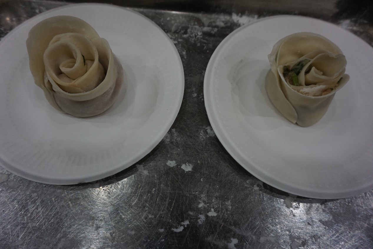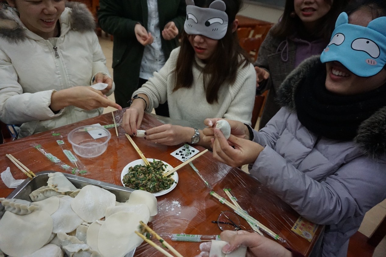 接下来的包饺子环节将整场活动推向高潮。在整个环节中,工作人员向每个小组分发饺子馅、饺子皮、面粉等包饺子需要的食材和工具。各小组还分别推选出代表,参与了蒙眼包饺子、男女合作包饺子等包饺子游戏。游戏过程紧张刺激,在“最美饺子”环节中,选手们包出的饺子形形色色、各有千秋,有圆肚状、花边状、三角花朵状,甚至还有玫瑰花状,令人大开眼界。最后,包好的饺子交给食堂师傅煮熟后,同学们吃着自己包的饺子,脸上洋溢着幸福的笑容,十分满足。