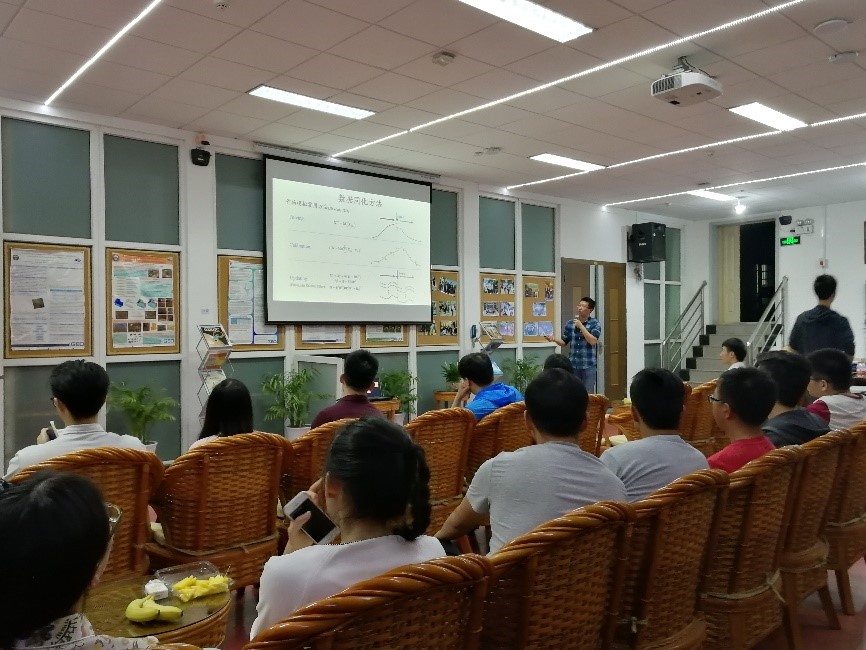 博士研究生胡顺就土壤水分运动和作物生长数据同化模拟方面作了报告。他提到,获取准确的农田水分及作物生长状态对农业水资源管理及粮食安全至关重要,在此背景下利用数据同化方法融合观测数据和物理模型提供最优状态估计成为研究热点。紧接着,他从理论研究(以玉米为例)及实际应用(以甘蔗为例)两个层面出发,对土壤水分及叶面积指数观测数据在作物生长数据同化模拟中的价值进行评价;同时,基于甘蔗生长特点,介绍了如何构建区域性通用统计回归模型。