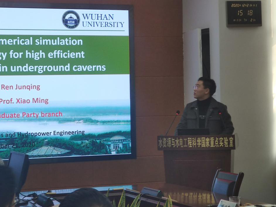 博士生任俊卿随后作了题为《Macro-meso numerical simulation and key technology for high efficient construction of elbow in underground caverns》的报告。任俊卿同学的报告包括三个部分,首先是施工关键技术:在水利水电工程中,由于地下洞室弯头结构复杂,施工难度大。针对传统施工方法精细控制困难、安全矛盾突出的问题,为解决这个问题,报告中提出了90°弯头可转换滑模、竖井斜拉灌注施工的创新技术。其次是宏观-细观耦合分析方法:针对施工中洞室的稳定性,根据围岩与衬砌的相互作用,基于PFC-FLAC离散连续耦合分析方法和声发射技术,研究了洞室的应力和损伤演化过程,揭示了宏观力学行为下的细观损伤机理。最后是可转换滑模施工经验控制模型:根据混凝土强度的发展规律和数值计算结果,提出了可转换滑模在任意施工荷载下的建议滑移时间的经验控制模型。