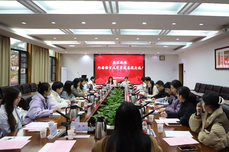 周翠芳副书记在讲话中表达了对学院研究生党建特色机构设置与完备制度建设的高度赞赏,并介绍了外国语言文学学院在促进广大研究生同学就业方面作出的长足努力,希望加强两院合作共享,通过交流学习开拓工作思路,提升研究生党建及研究生会工作成效。