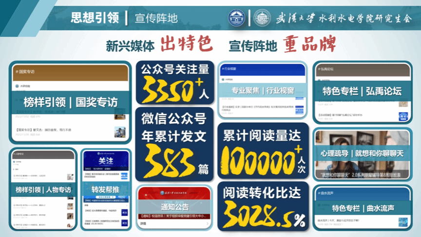 宣传阵地不断优化宣发结构,着力打造一网、一微、一博、一号的“四个一”水研宣传体系。推文保质保量,专栏不断上新。“水研珞珈”公众号关注量超3300人,年度累计发文383篇,累计阅读量超十万人次,品牌影响力逐年提升。