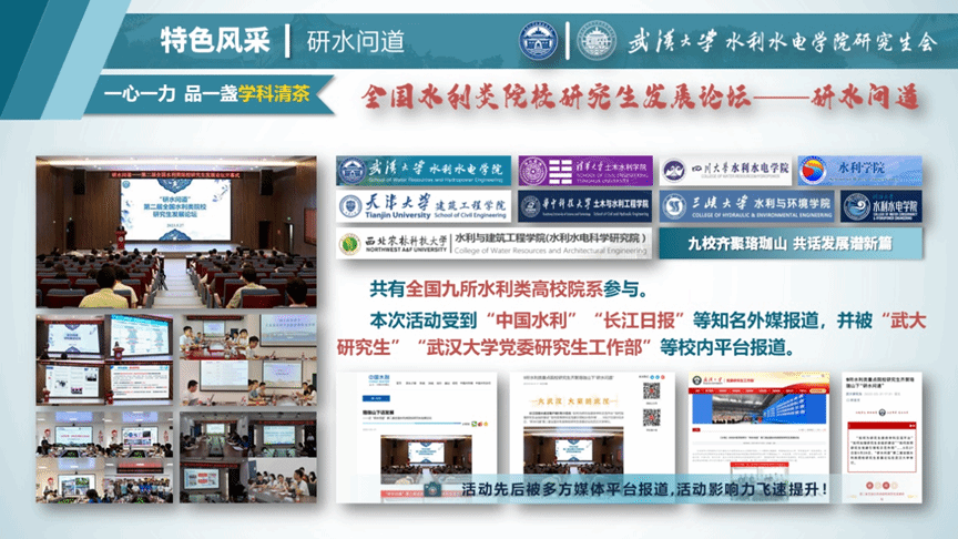 学科清茶,一心一力!第二届“研水问道”发展论坛,聚焦武大“团队建设年”发展主题,规模及影响力空前扩大,全国9所水利高等院校齐聚洛珈山,共话学科发展与人才培养,同时也受到了各级官媒报道。